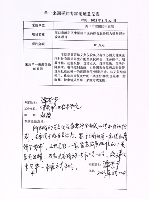 周口市淮陽區中醫院中醫藥綜合服務能力提升部分設備項目單一來源采購公示